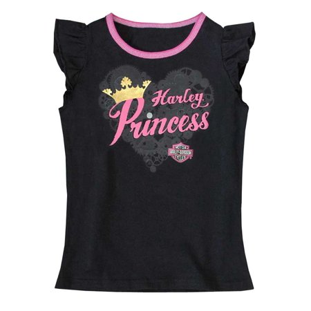 Harley-Davidson Big Girls' Harley Princess Jersey TeeMade of 100% cottonFeatures a background grey heart made of gears with a pink "Harley Princess" and a gold crown designHigh V-neck and ruffled cap sleeve sleevelessColor: Black with pink, gold, grey and silver accents