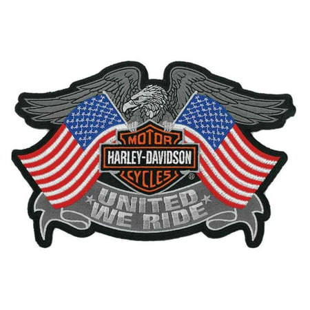 Size: 8" W x 5.25" H.Harley-Davidson United We Ride EmblemLarge size patchFeatures an awesome, patriotic Bar &