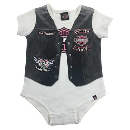 Perfect for your little Harley gal! Harley-Davidson Baby Girl's Printed-On Motorcycle Vest Newborn CreeperMade of 100% cotton interlockAdorable screen printed trompe l'oeil motorcycle vestPerfect for your little Harley gal! White creeper